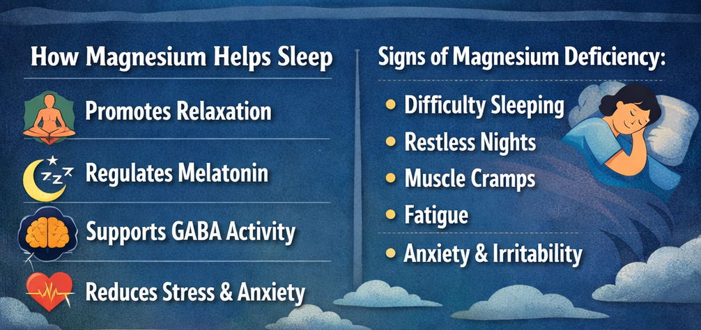 Magnesium is a vital mineral involved in more than 300 biochemical reactions in the body. It plays a key role in muscle function, nerve signaling, energy production, and heart health. Importantly, magnesium also helps regulate neurotransmitters and hormones that influence sleep.